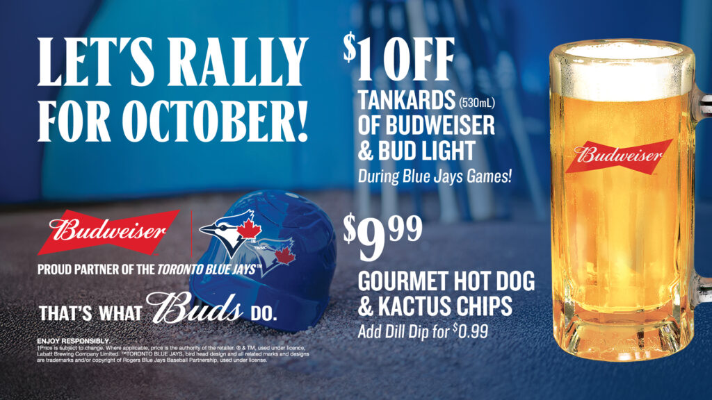 Cheer on the Toronto Blue Jays in the playoffs with specials that hit it out of the park! During every Blue Jays game, enjoy $1 off tankards of Budweiser and Bud Light, plus a $9.99 gourmet hot dog served with Kactus Chips. Make your chips even better by adding Dill Dip for just $0.99.