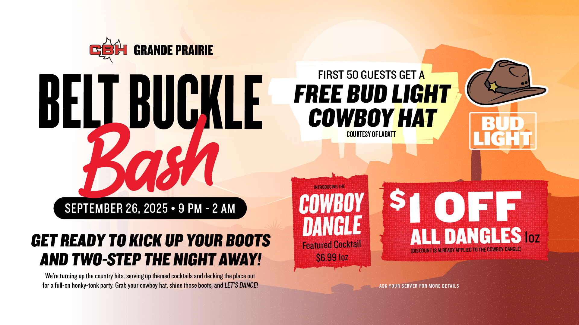 Kick up your boots at the Belt Buckle Bash! Two-step to country hits, enjoy themed cocktails, and dance the night away at CBH Grande Prairie.