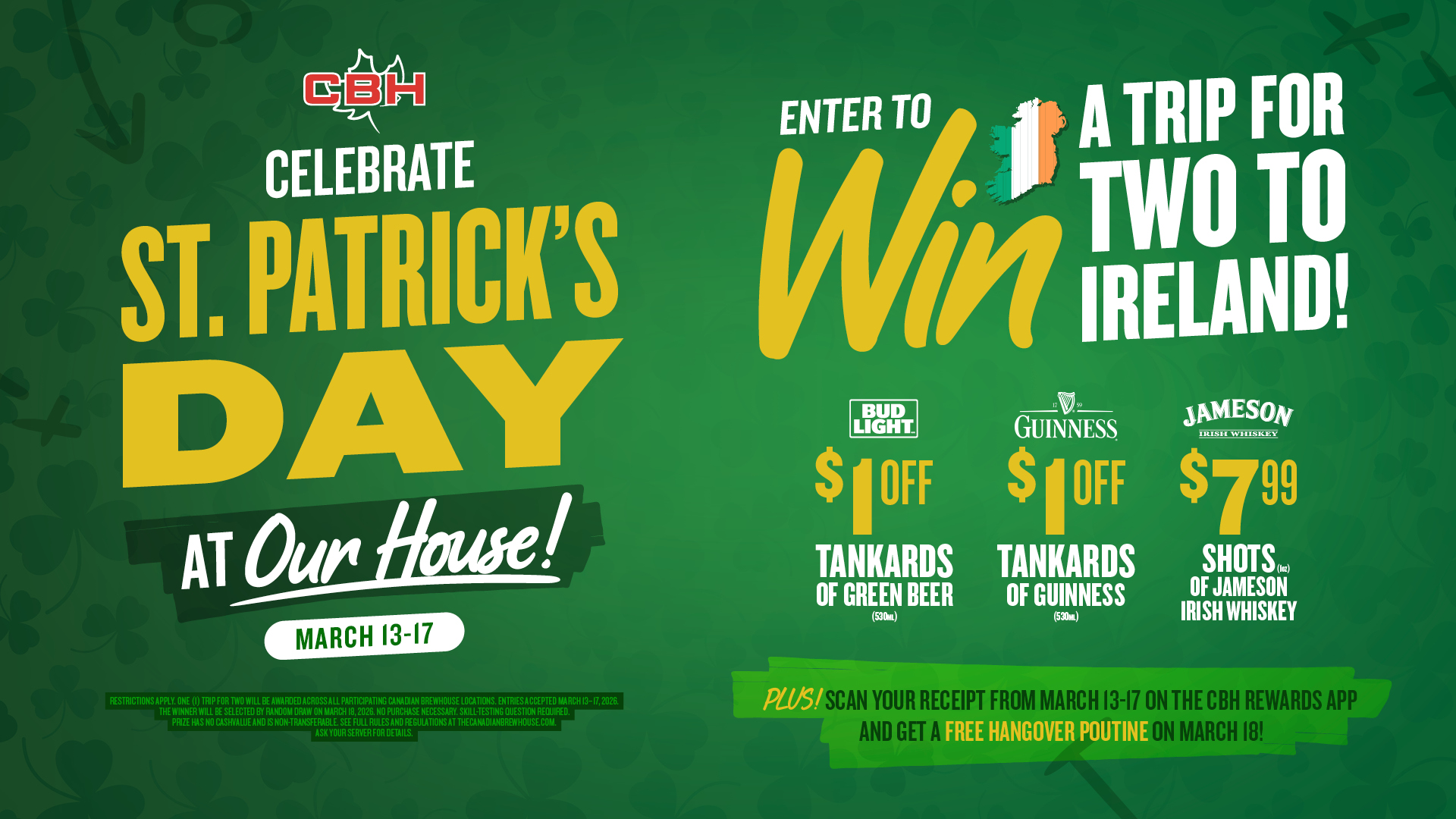 All green everything at our house this St. Patrick's Day: enjoy amazing specials and enter for a chance to win a trip for two to Ireland!