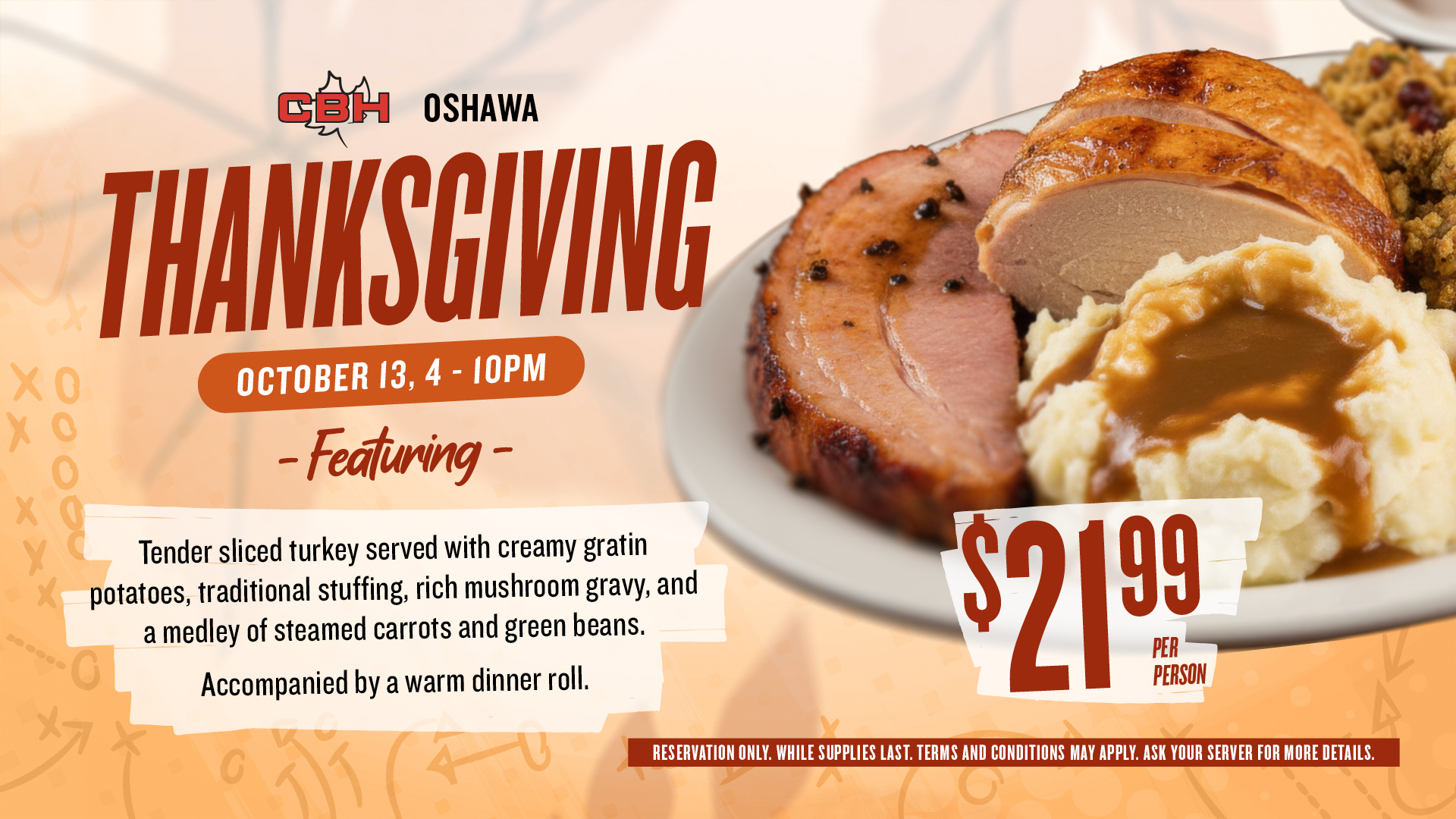 Enjoy a festive Thanksgiving dinner at CBH Oshawa on Monday, October 13 with all the classic seasonal favourites.