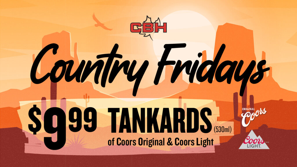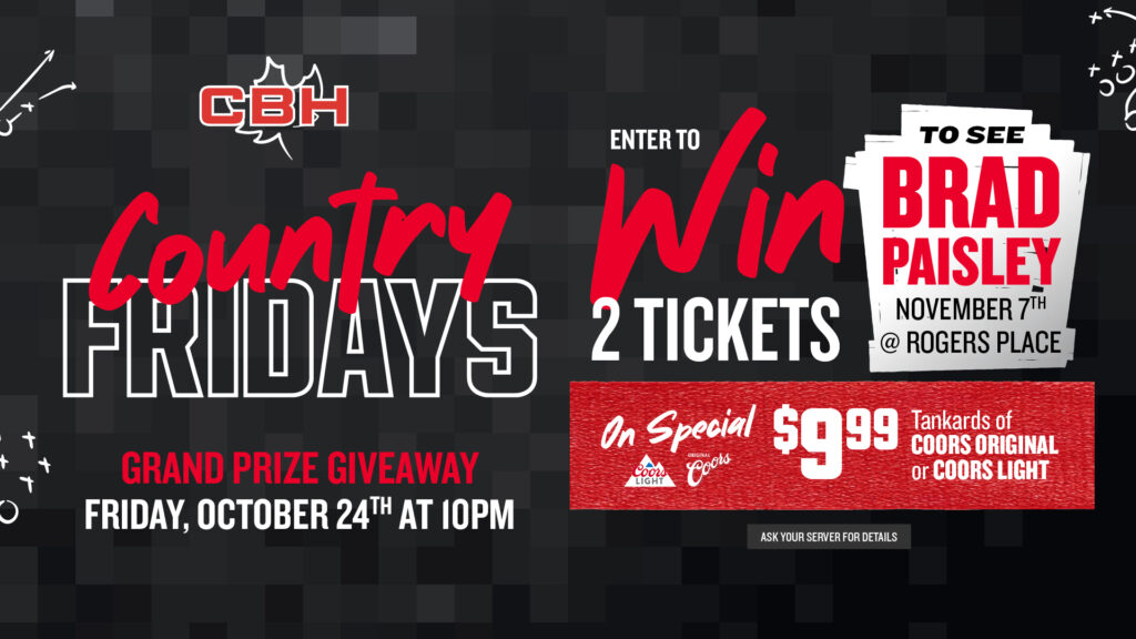 Enter weekly at the CBH Spruce Grove, Leduc, and Fort McMurray locations. Winner will be drawn and announced on October 24, 2025 in-house at 10:00PM MST. Must be 18+ to win. Must be in attendance to win. No purchase necessary. Ask your server for details.