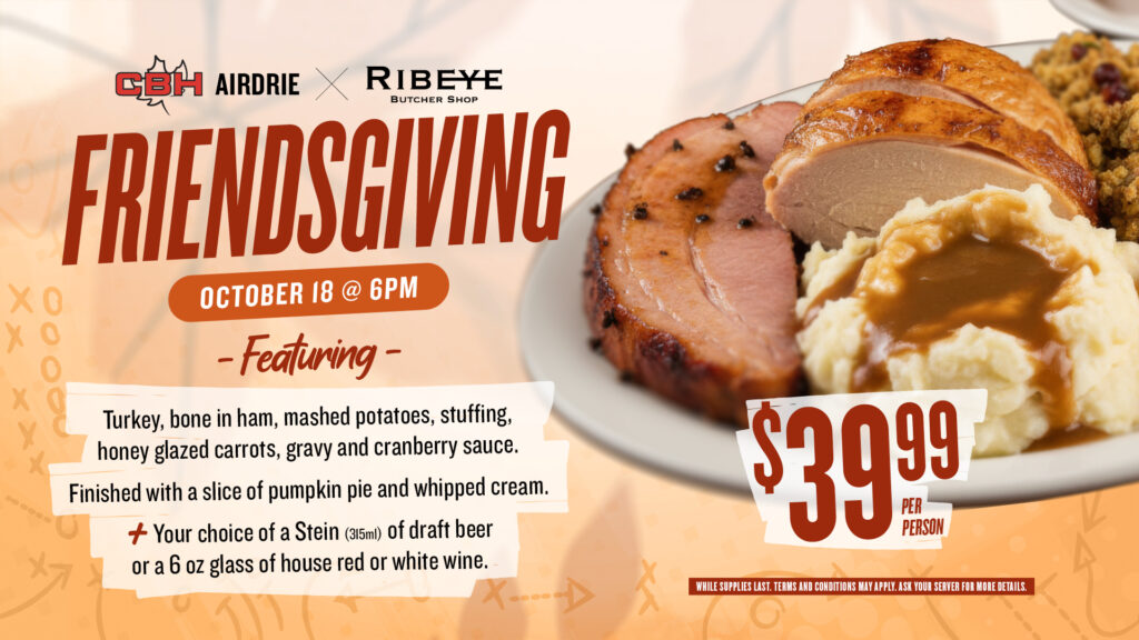 Gather your friends and join us for a special Friendsgiving dinner at CBH Airdrie in partnership with Ribeye Butcher Shop. On Saturday, October 18 at 6:00pm, we’ll be serving up all the classic flavours of the season in a cosy, festive setting.