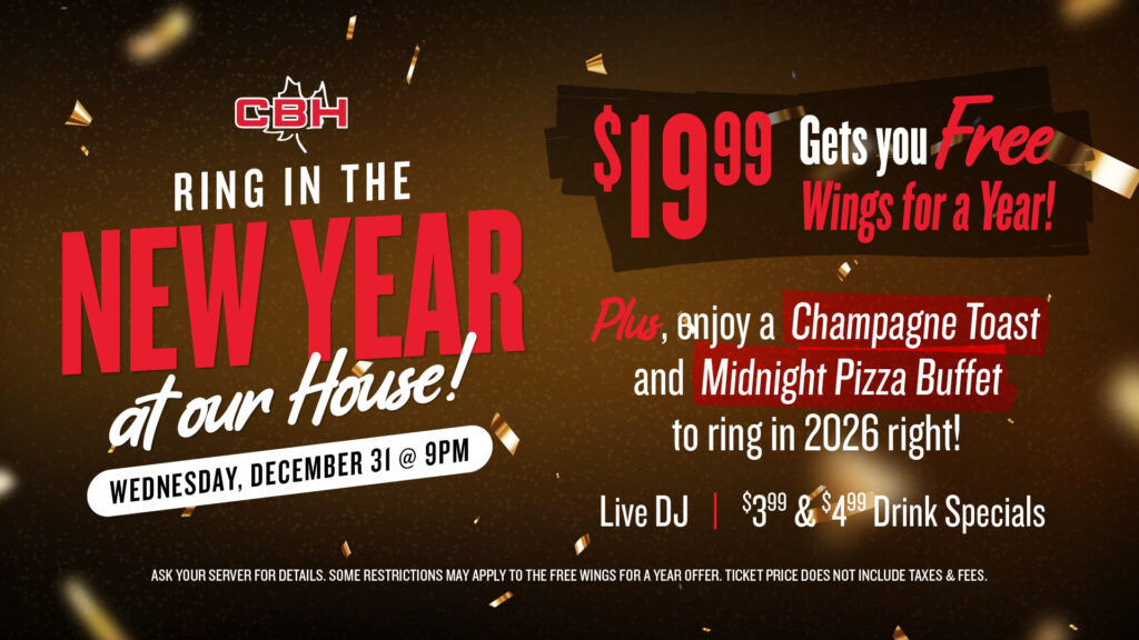 Celebrate New Years Eve at Our House with Free Wings for a Year, a midnight pizza bar, and a champagne toast.