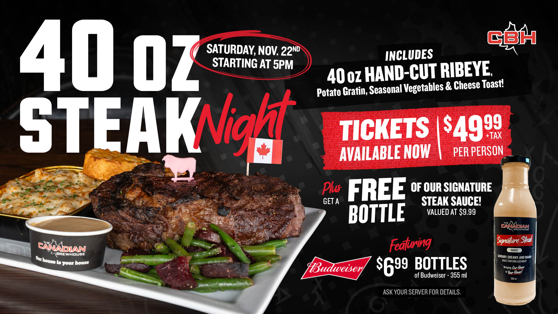 Get ready for 40oz Steak Night this November! Enjoy a hand-cut 40oz Ribeye and take home a free bottle of The Canadian Brewhouse Steak Sauce. Tickets available now.