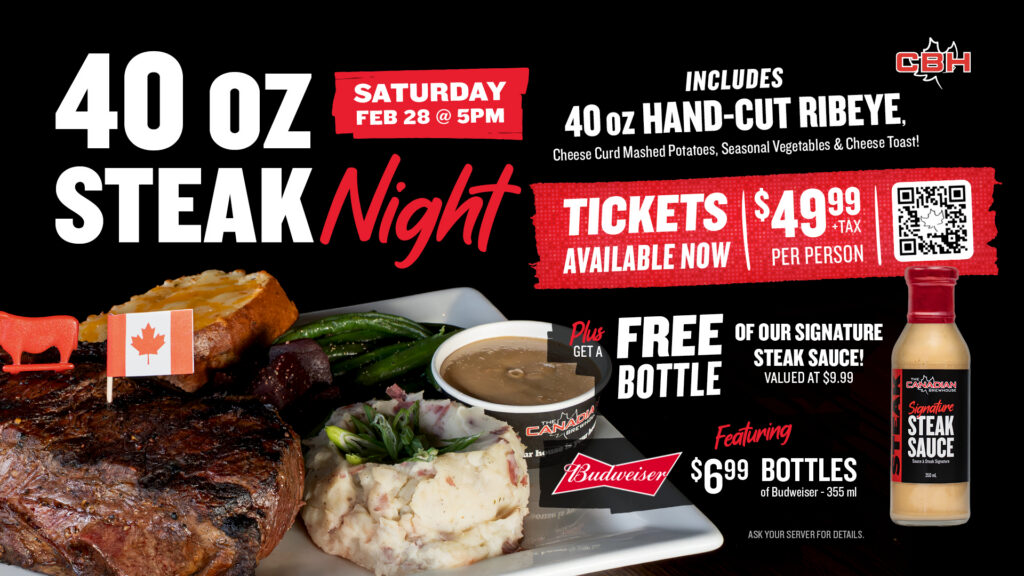 Get ready for 40oz Steak Night this February! Enjoy a hand-cut 40oz Ribeye and take home a free bottle of The Canadian Brewhouse Steak Sauce. Tickets available now.