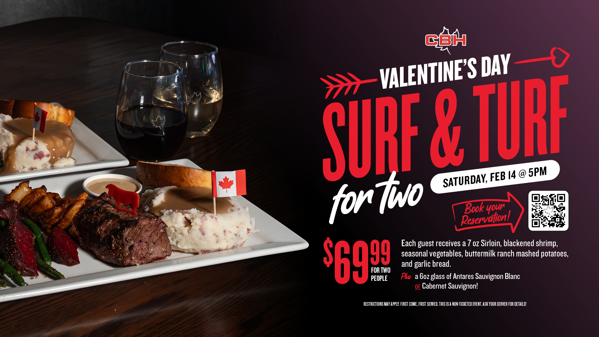 Join us for our special Valentine's Day Surf & Turf Dinner for Two! Dinner starts at 5pm and features a 7oz sirloin topped with blackened shrimp, served with seasonal vegetables, buttermilk ranch mashed potatoes, and garlic bread. Plus it includes a glass of house red or white wine!